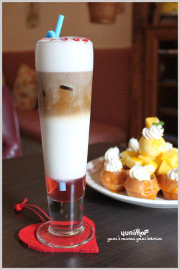 婗媽點的玫瑰咖啡...長得很漂亮...底層是玫瑰粹取的汁液..最上層也有玫瑰蜜所勾勒的花樣...玫瑰很香.