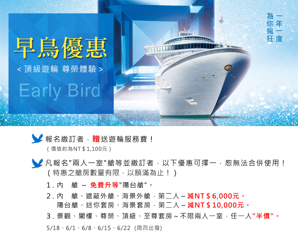 ✓贈獎內容:藍寶石公主號免費雙人遊輪X1名