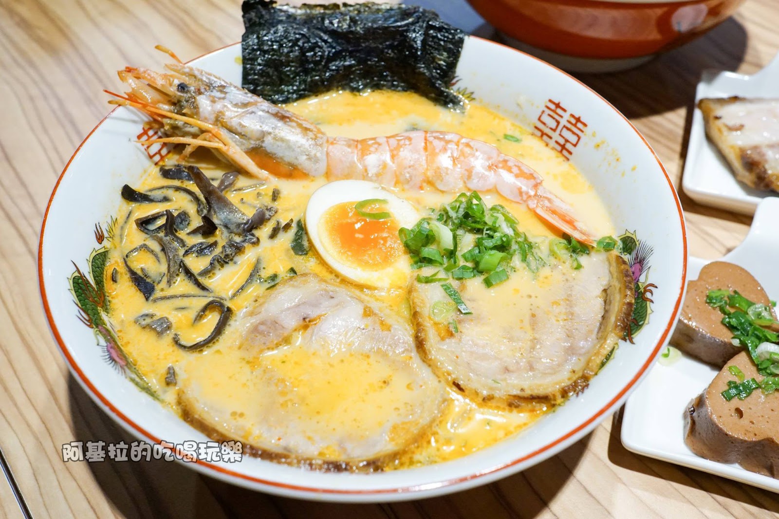 碗裡的配料十分豐富,有「天使紅蝦、叉燒、溏心蛋、花椰菜、黑木茸、蔥花、豆芽、海苔」,150元就能吃到這麼多,已經相當划算了。