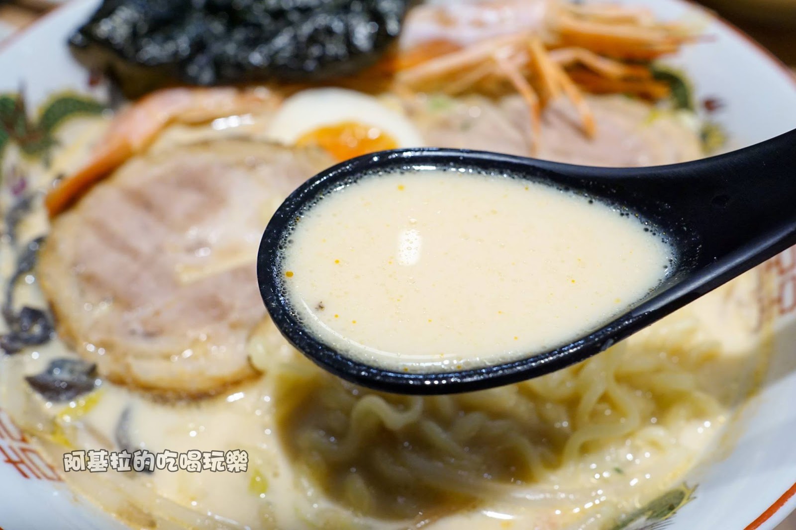使用「蔬果雞高湯」和「牛奶」調合,喝起來香濃、甘甜、順口,鹹度也剛好,很接近豚骨湯頭的感覺,相當好喝,會讓人想整碗喝完。