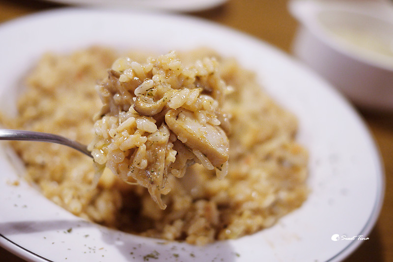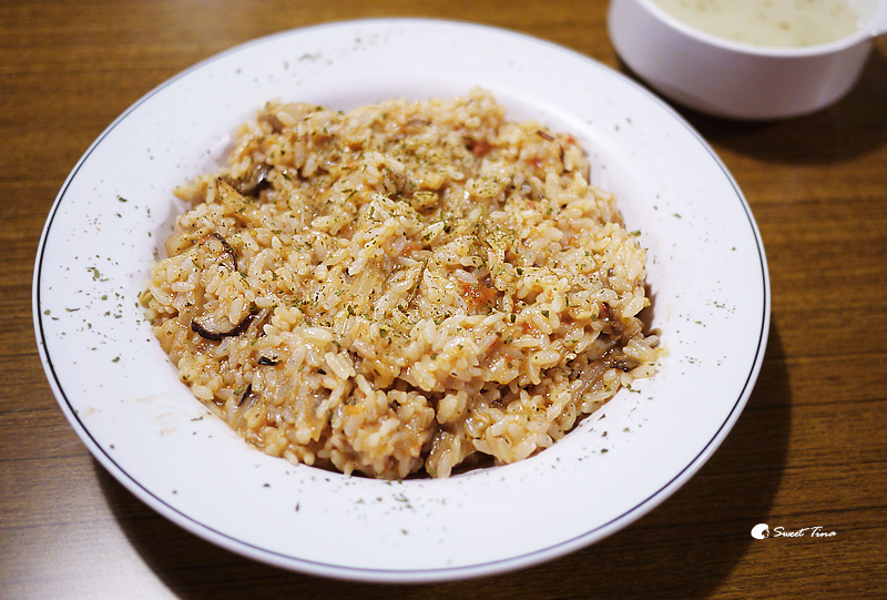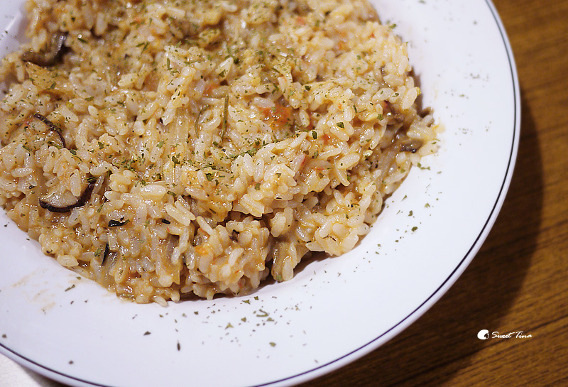 【特調粉紅風味雞肉燉飯】其實我還挺喜歡粉紅醬的,帶點奶香及蕃茄酸甜,剛剛好的口感吃起來也不會過膩,不過薰衣草也未免太料好實在了吧,盤子整個被飯塞得滿滿了,而且裡頭的料也不少哦,有香菇、洋蔥、雞肉。