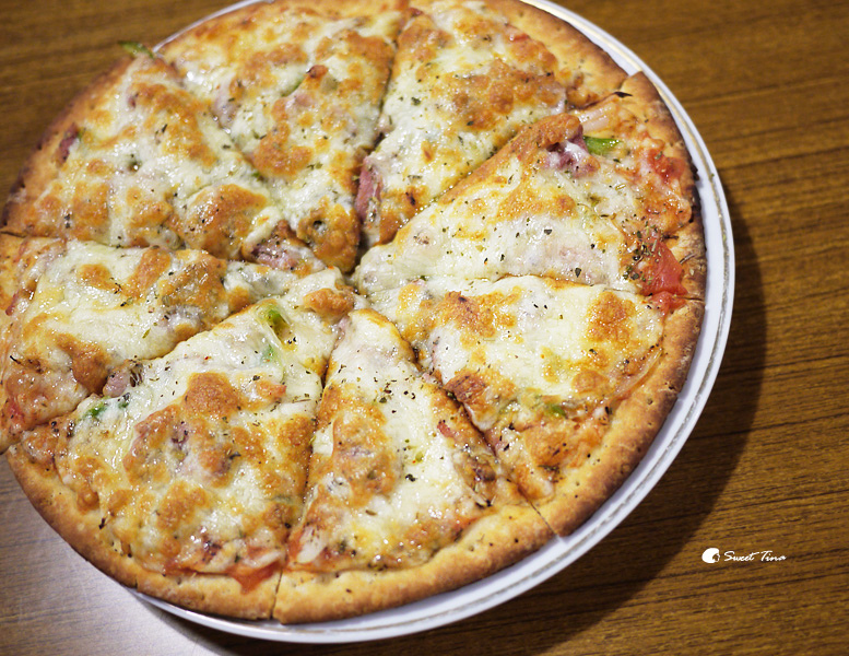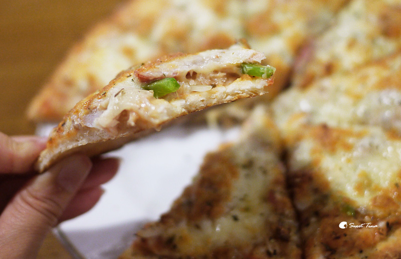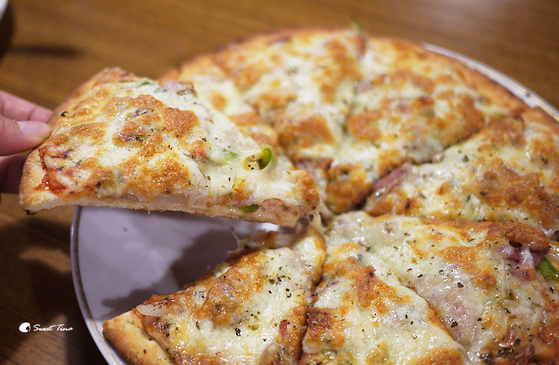 【培根鮪魚PIZZA】採用雙層起司烘烤,上頭餡料飽滿,下頭餅皮酥酥脆脆的,而且這份還不小咧,本來以為是小小一盤,所以點來讓瑋兒吃,但麵和飯都那麼紮實飽滿了,這盤又這麼大,真的不行啦,最後打包當下午的點心了XD~