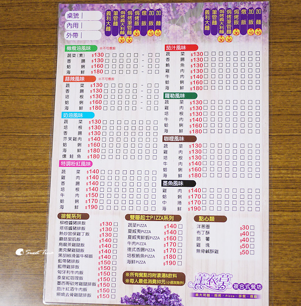 來看看薰衣草 Pasta有哪些餐點項目吧,義大利麵及燉飯醬料就有八類,還有排餐、PIZZA、點心類。
