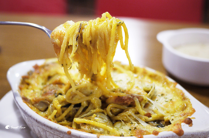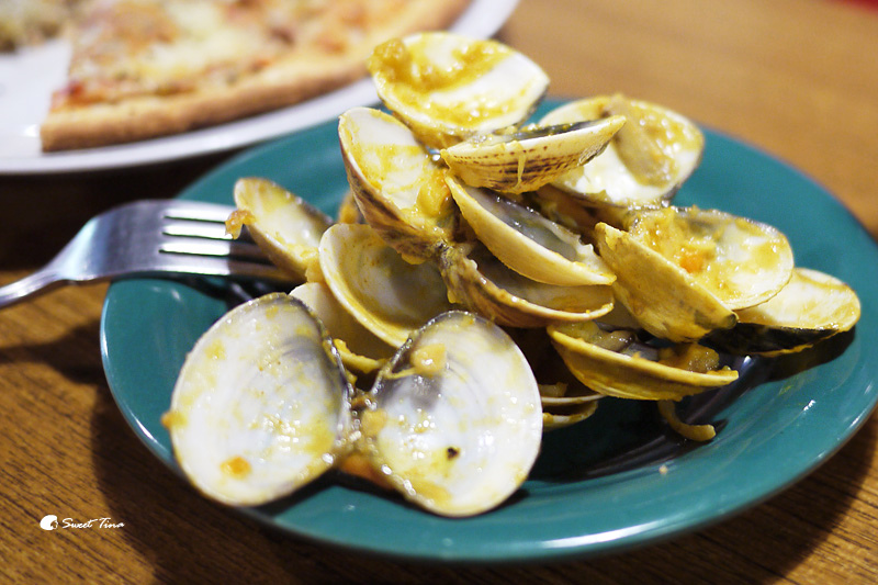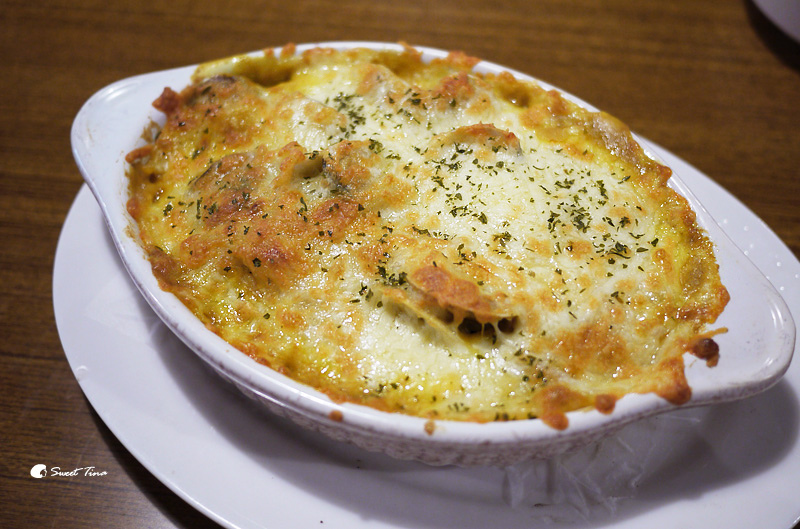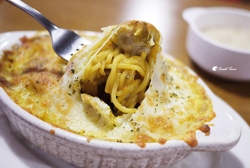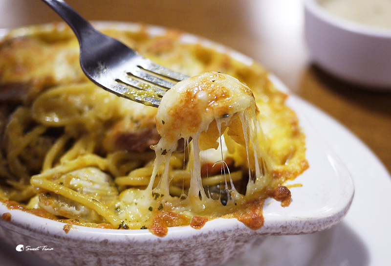 【咖哩風味蛤蜊義大利麵】咖哩風味的義大利麵感覺比較少見點,所以Tina特別點來品嚐看看,上頭焗烤的起司厚度還不小,是能讓人滿足的起司口感,裡頭還塞了不少蛤蜊呢。