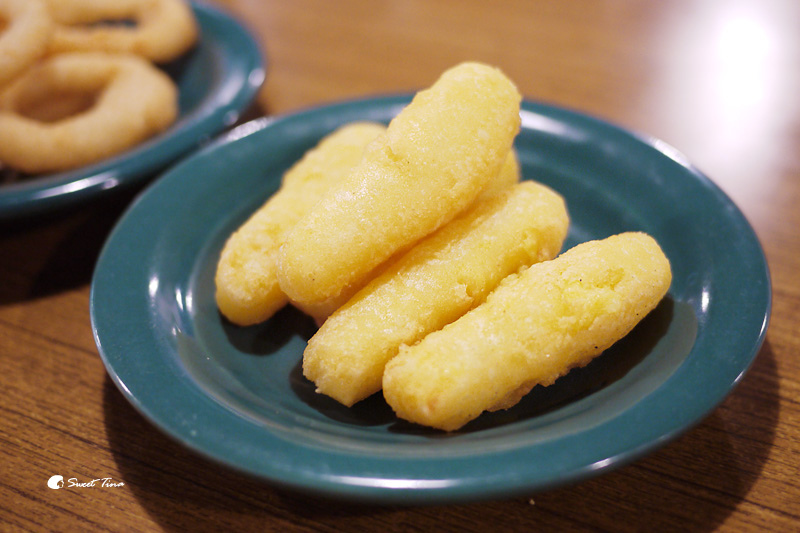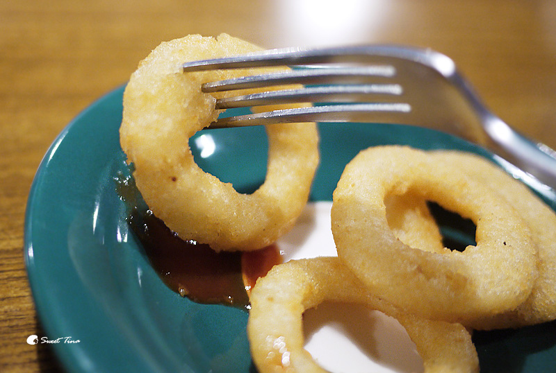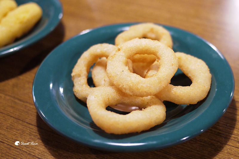 【洋蔥圈】一樣酥酥脆脆,裡面保有溼潤感,洋蔥圈本身就有調味,所以單吃就很可口,喜歡沾醬的朋友也可以自行取用醬料。