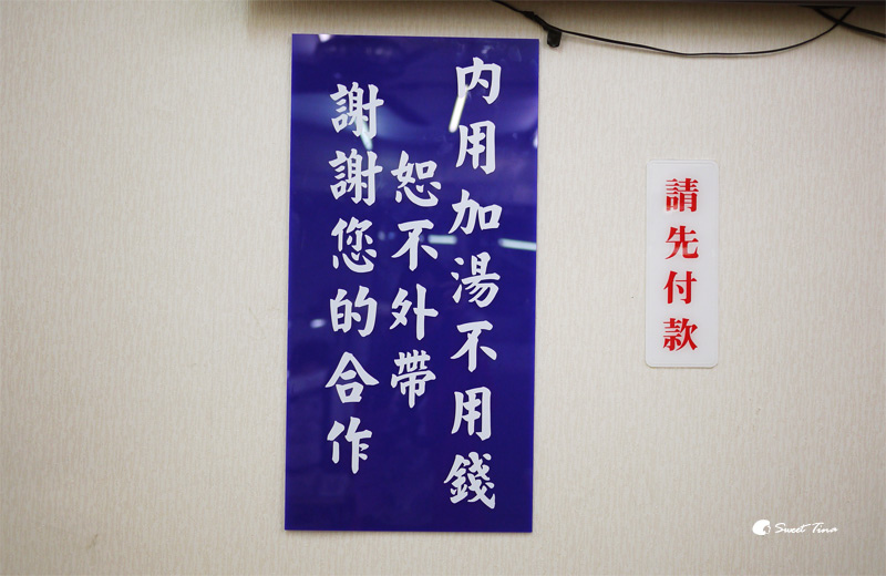 一進去就看到這大大標示,一定要特寫一下,「店內加湯不用錢」,哇~牛肉湯都是慢火熬煮2~3天,如胃口夠大的朋友太有口福了,不過他們的份量挺大的,我吃完就快撐爆啦,完全沒辦法加湯啊~