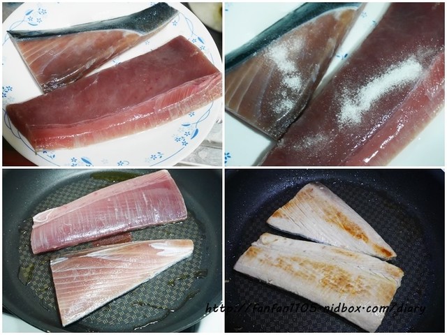 退冰後的鮪魚回復到鮮紅Q彈的感覺,簡單灑上鹽巴,使用些許油煎,煎到雙面微焦即可盛盤
