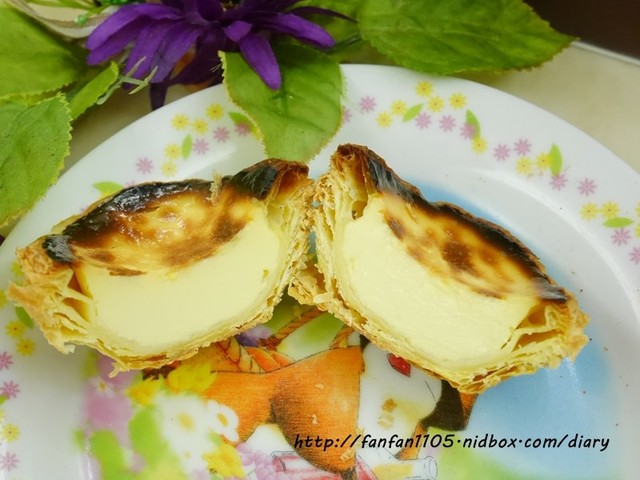 剛烤好的蛋撻一口咬下,外皮香酥喀滋喀滋的、內餡好像布丁一樣軟嫩有濃濃的奶香且不甜膩,一次吃下二顆也不是問題