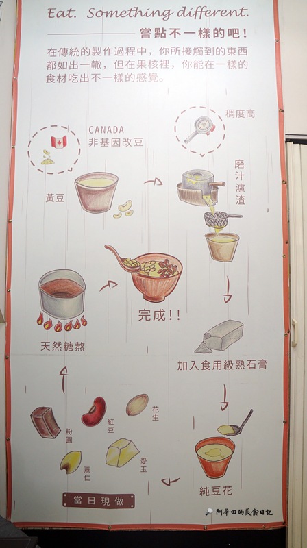 ▲Eat somethingdifferent是果核豆花鄉的座右銘!嘗點不一樣的吧!使用非基因改良的黃豆,經過磨汁濾渣後,再加入可食用的熟石膏,純豆花就完成了,再來每日現做的配料,最後加入熬煮的糖水,大功告成!