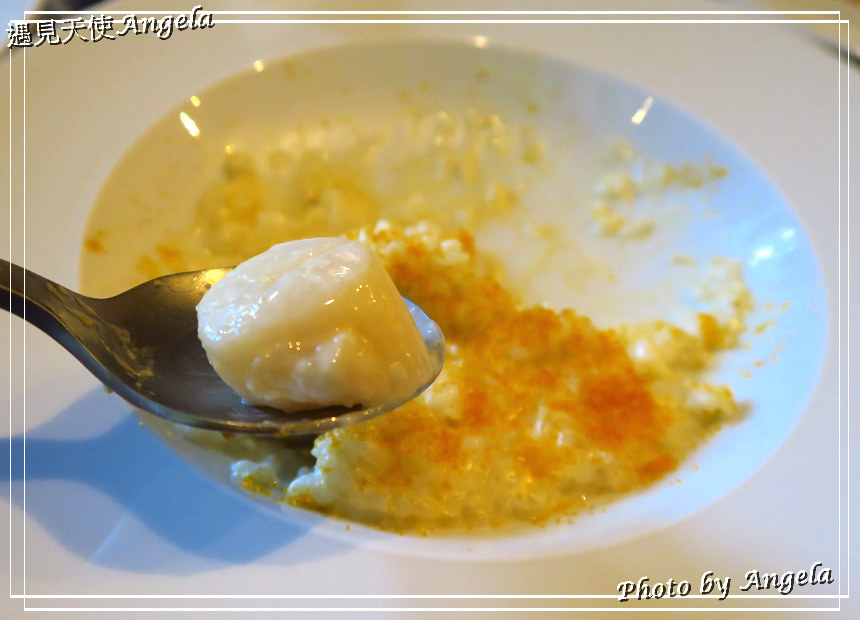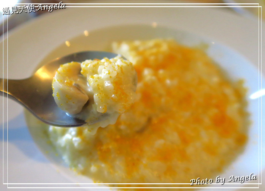 是說這個花灑烏魚子干貝燉飯的干貝在哪裡呢?! 邊吃邊挖寶,吃到一半發現裡面有2顆飽滿的干貝,干貝肉質滿鮮甜的~