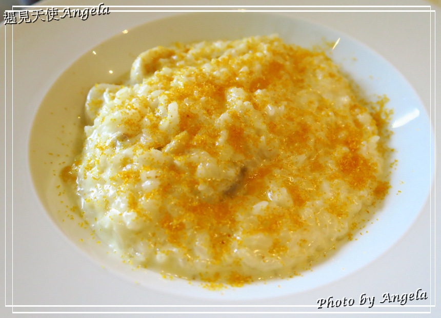 另一個主餐是花灑烏魚子干貝燉飯,這個燉飯米粒是半生透的,吃起來軟中又帶點米心微硬的口感,很道地的義式風。