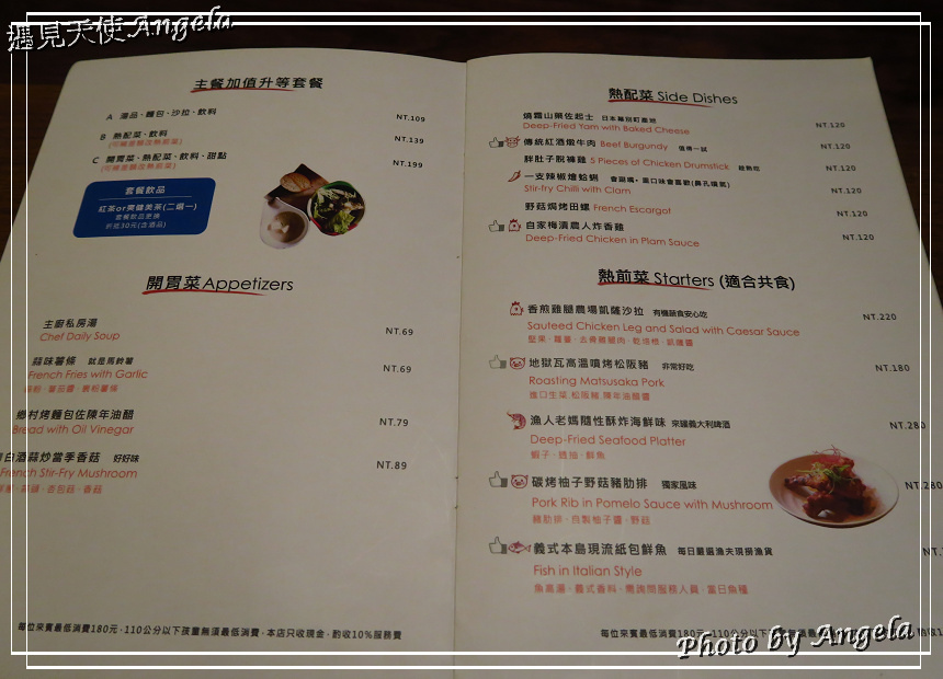 店內的的餐點有2-4人的套餐組合,也有單點主餐加價升級套餐的用餐方式。基本上每人低消180元+10%服務費。