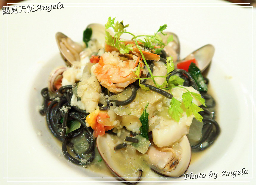 朋友點的香蒜白酒海鮮墨魚麵,據說味道很鮮甜,海鮮食材都很新鮮肉質有彈性。
