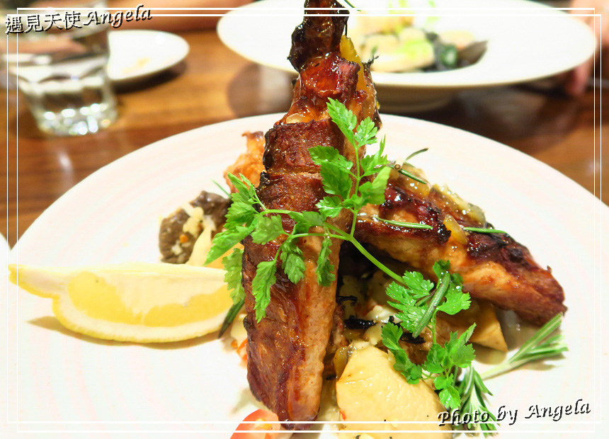 熱前菜,碳烤柚子野菇豬肋排。這道料理味道不錯,豬肋排有醃入味,外層有微微的柚香甜味。