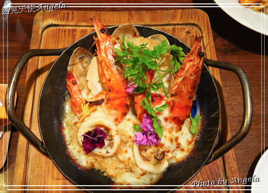 主餐-古羅馬海味十足奶油焗烤飯。這道料理一上桌就很吸睛!!! 看看這鮮美的2隻大蝦、肥碩的扇貝、蛤蠣與中卷,海鮮配料好豐富~