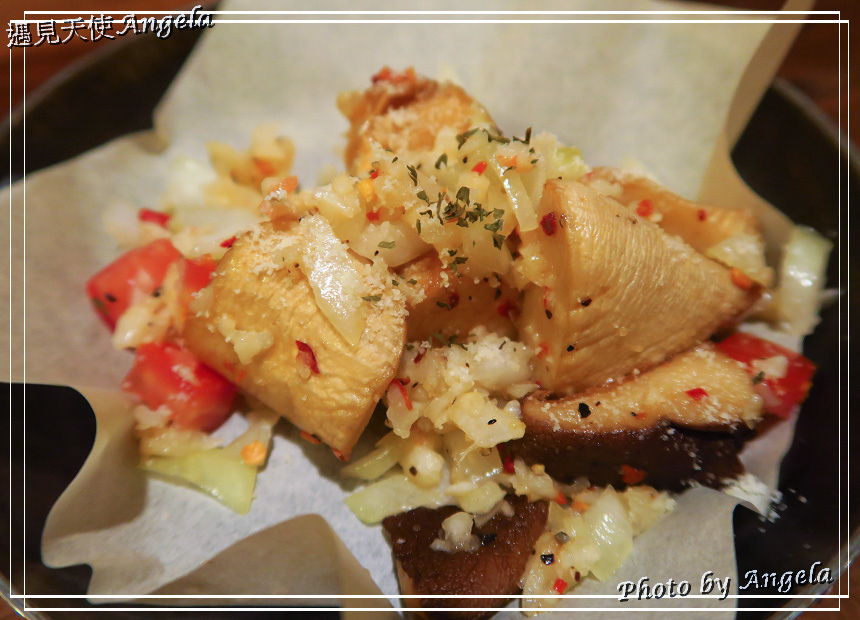 開胃菜,白酒蒜炒當季香菇。採用新鮮的杏鮑菇與香菇,加上切碎的大蒜拌炒,吃的到菇類的鮮甜味,還有大蒜的辛辣味。