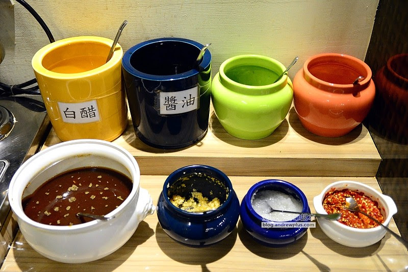 ▼自助區裡面提供的兩種飲料,雖然只有兩種,但兵不再多;以及多種的調味料供客人自行取用