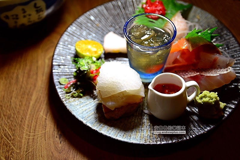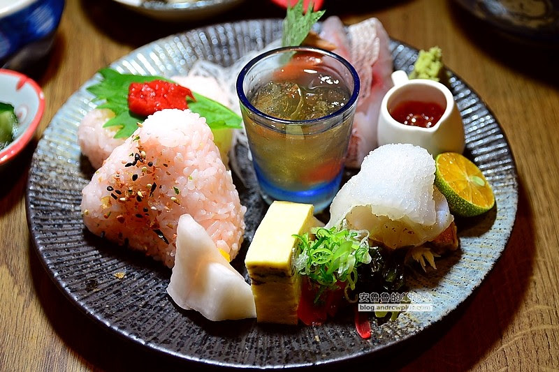▼葡萄果醋凍喝起來開胃,底層舖著吃一口酸鹹會皺一下眉頭的梅子肉、旁邊的小壺裡面是鮭魚卵、4~5片生魚片分別是鮭魚、姬鯛、尖梭和黃雞魚。一旁的醃蘿蔔、玉子燒、蔥花、海帶芽、紅薑片、山葵可酌量使用。特別提醒紫蘇葉上的鮮紅物體是梅子肉,鹹度和日本當地不相上下,記得小心食用。