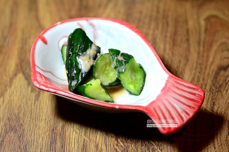 ▼味增醃製的小黃瓜吃起來清脆,鹹度稍微重一些,搭著胡麻醬增加香氣