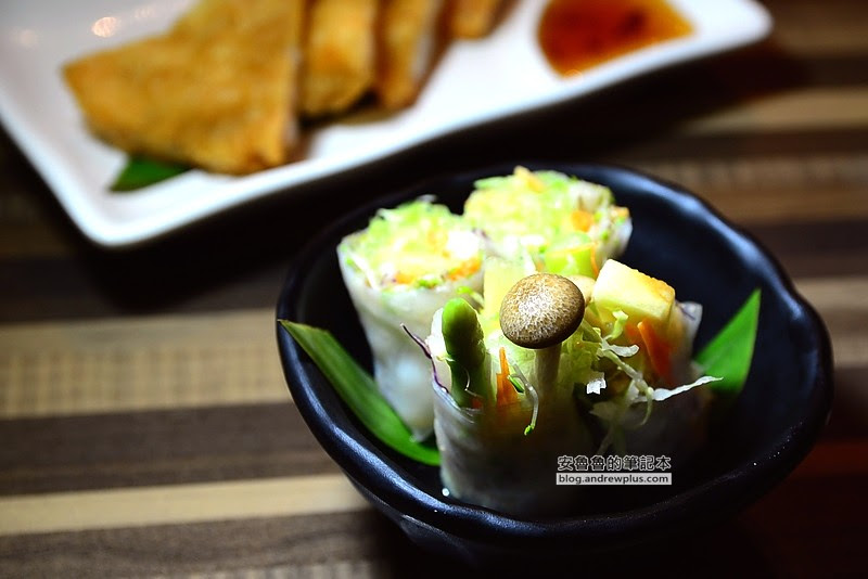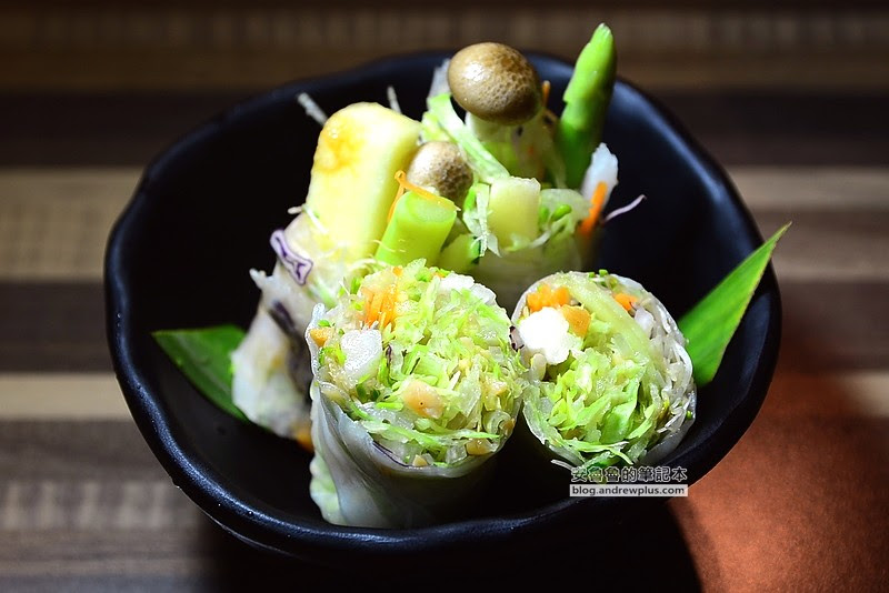 水感半透明,又帶Q彈的春捲皮,包裹著充滿水份充足的蔬菜,加上鴻禧菇、蘆筍、蘋果,底層帶著酸甜醬汁,清爽好入口