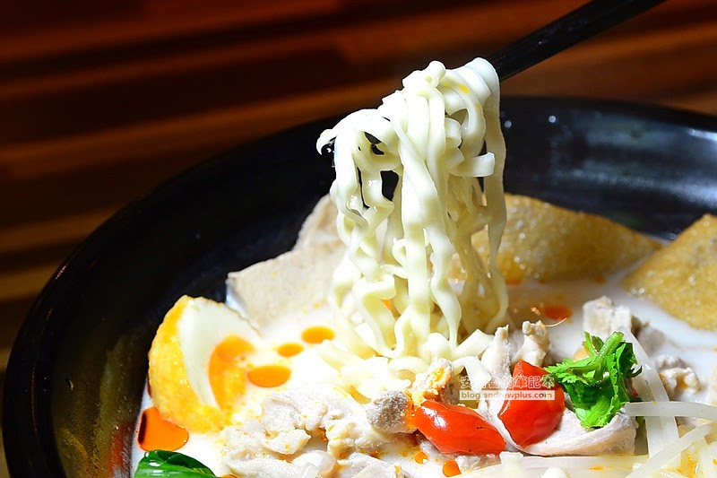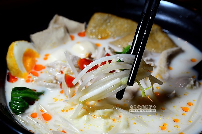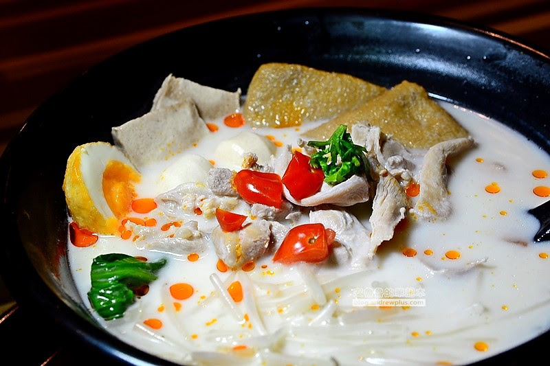 整碗麵的成員有切塊的軟嫩雞腿肉、去頭尾豆芽菜、切片小番茄、油豆腐、魚板、魚丸、女婿蛋。白湯上頭加入了些許辣油,以為是走微甜路線,喝起來卻是鹹香以及濃濃的椰漿味道。雞腿肉吸收了椰汁的香味確是很吸引人,還有油豆腐也會吸湯,吃的時候要小心噴汁燙到