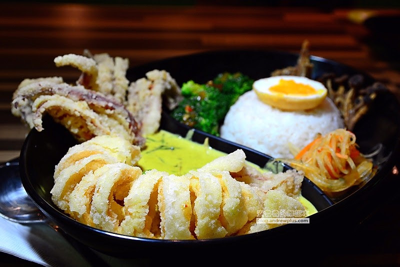 主角霸王魷魚的模樣果然吸睛,麵衣炸得酥脆,但是魷魚的肉質依舊保持著軟Q,一定要沾著裡面有青豆仁、長豆、圓茄的綠咖哩吃,吃第一口的時候以為綠咖哩辣度也不過爾爾,直到第二口、第三口,這才發現我錯了!!綠咖哩開始發威~舌頭上開始起火燒,汗開始飆了,趕緊拿起蜂蜜檸檬蝶豆花止止辣,飲料喝完了就繼續灌水了。
