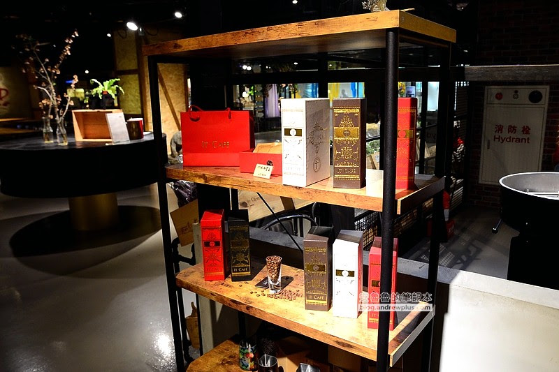 ▼當然烘培出來的咖啡豆,也要有好的行銷設計,旁邊的櫃子上是小油罐包裝的咖啡豆產品