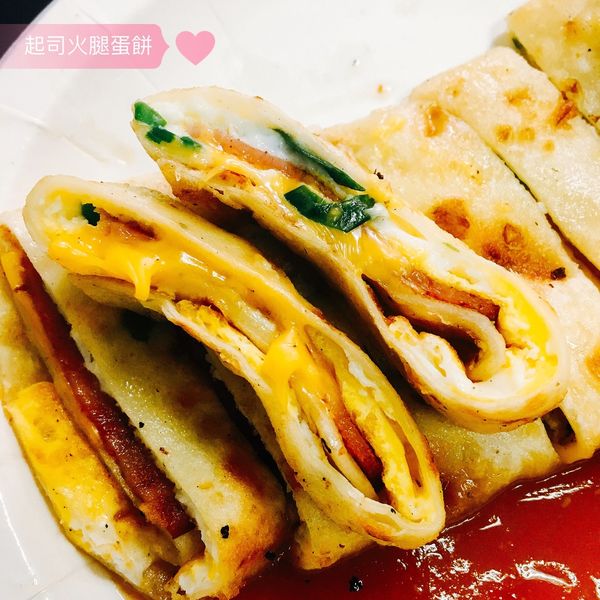 加了起司的火腿蛋餅密合性很好,完全不會散開。喜歡這種煎得透透的火腿。