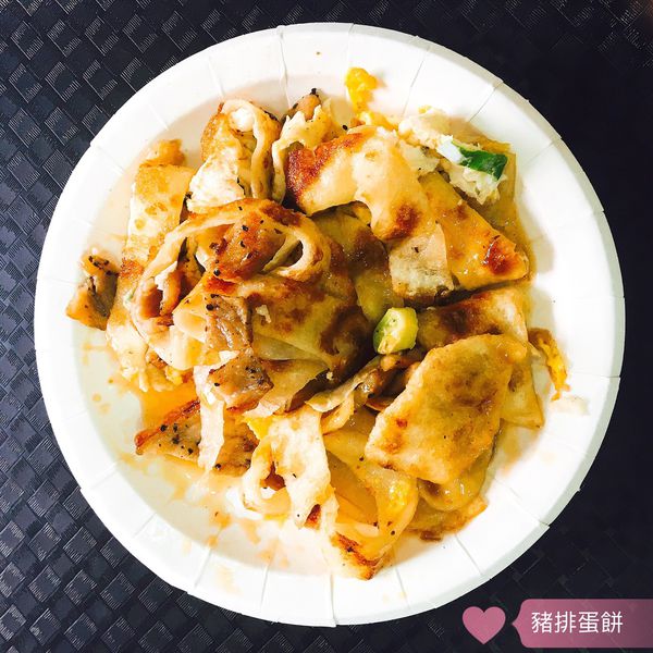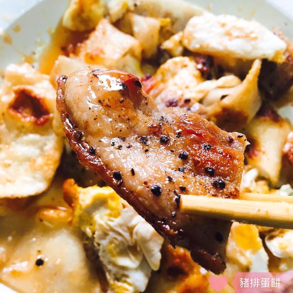 豬排蛋餅中的豬排,不是肉泥合成的肉排,而是整塊的完整豬肉排煎熟切碎,