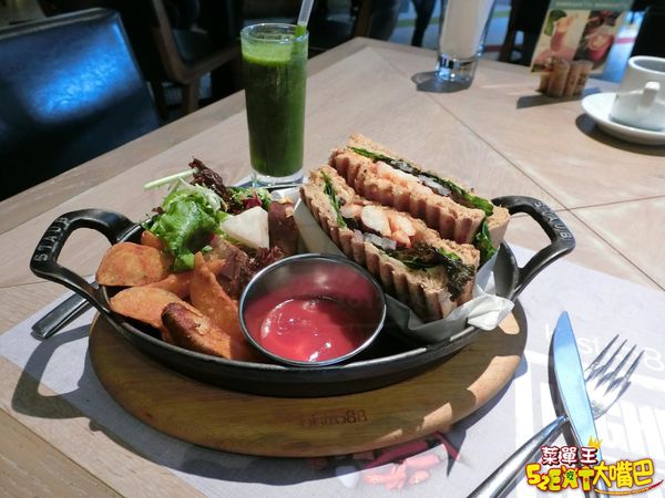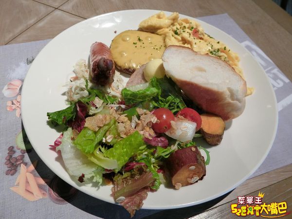 ▼整份套餐的份量驚人,黃色澤的歐姆蛋還有奶油軟法麵包、生菜沙拉,光是生菜沙拉裡的食材就非常有飽足感,精選地瓜、麥片、水果…等,整體看起來色彩繽紛,營養均衡,該有的通通都到位了。
