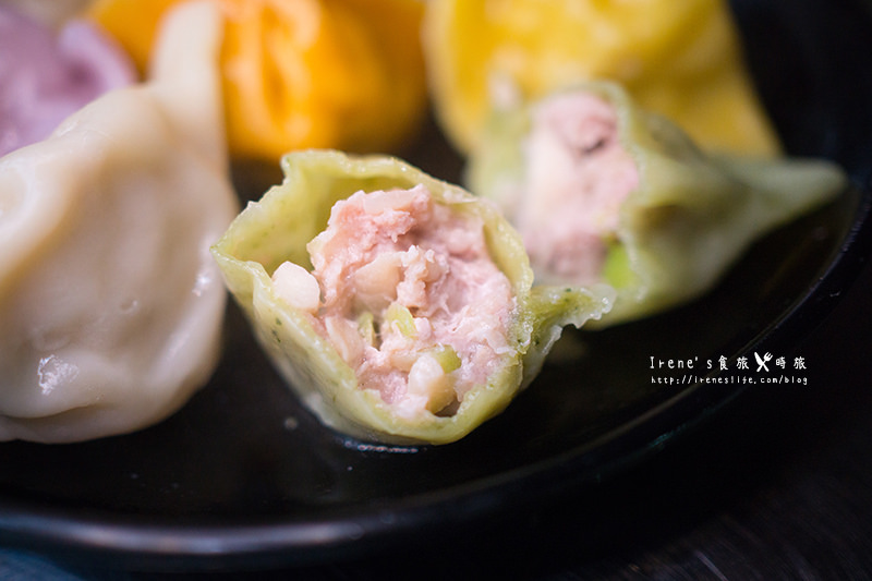 紫色餃皮的是雞肉口味,雞肉不柴,淡淡的雞肉甜味,幾乎沒有什麼蔬菜來搶風頭,很清爽的口味。