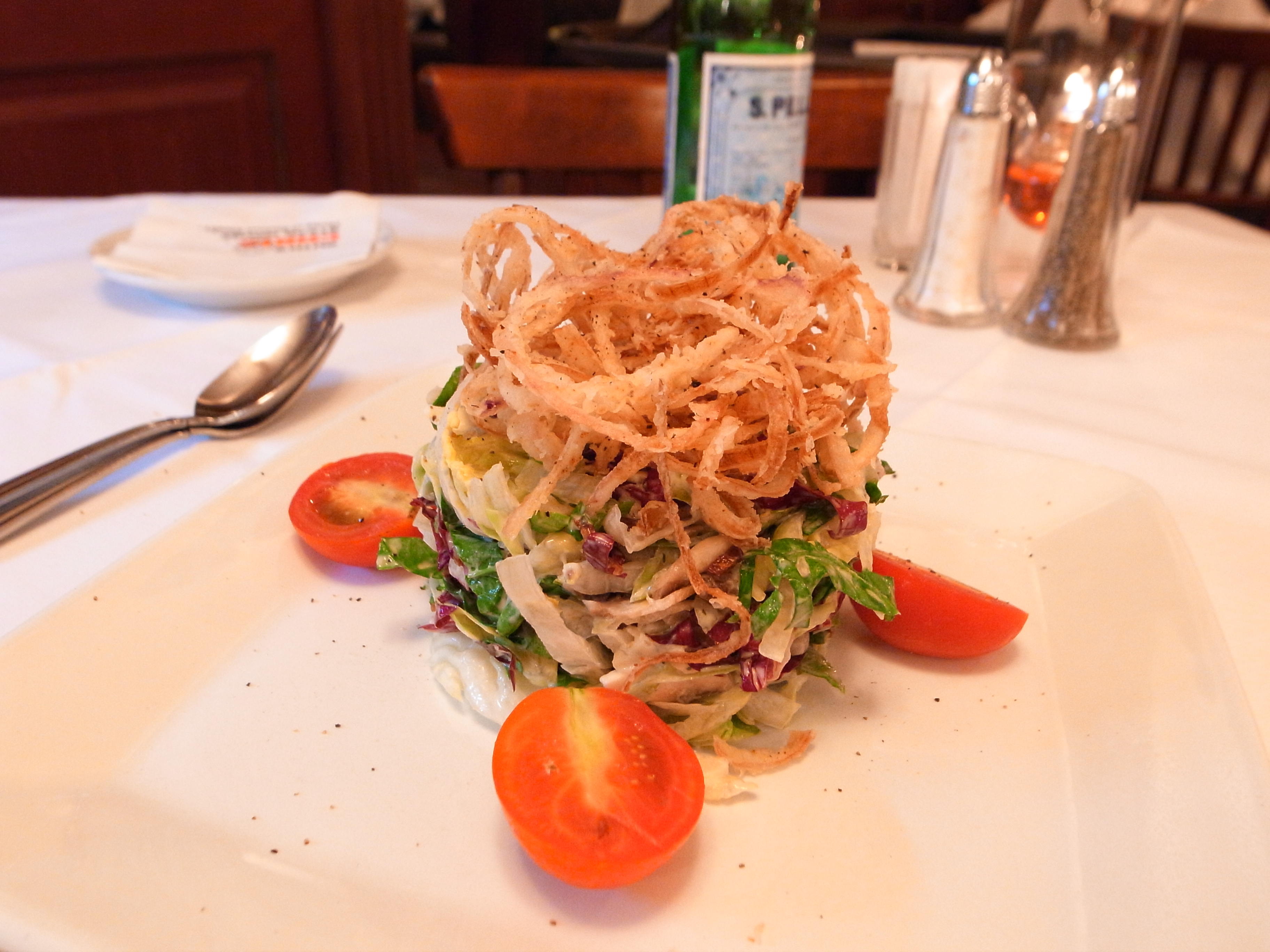 後者上頭擺疊在一起的炸紅洋蔥圈,下方則是扮著醬汁與藍紋起司的生菜,