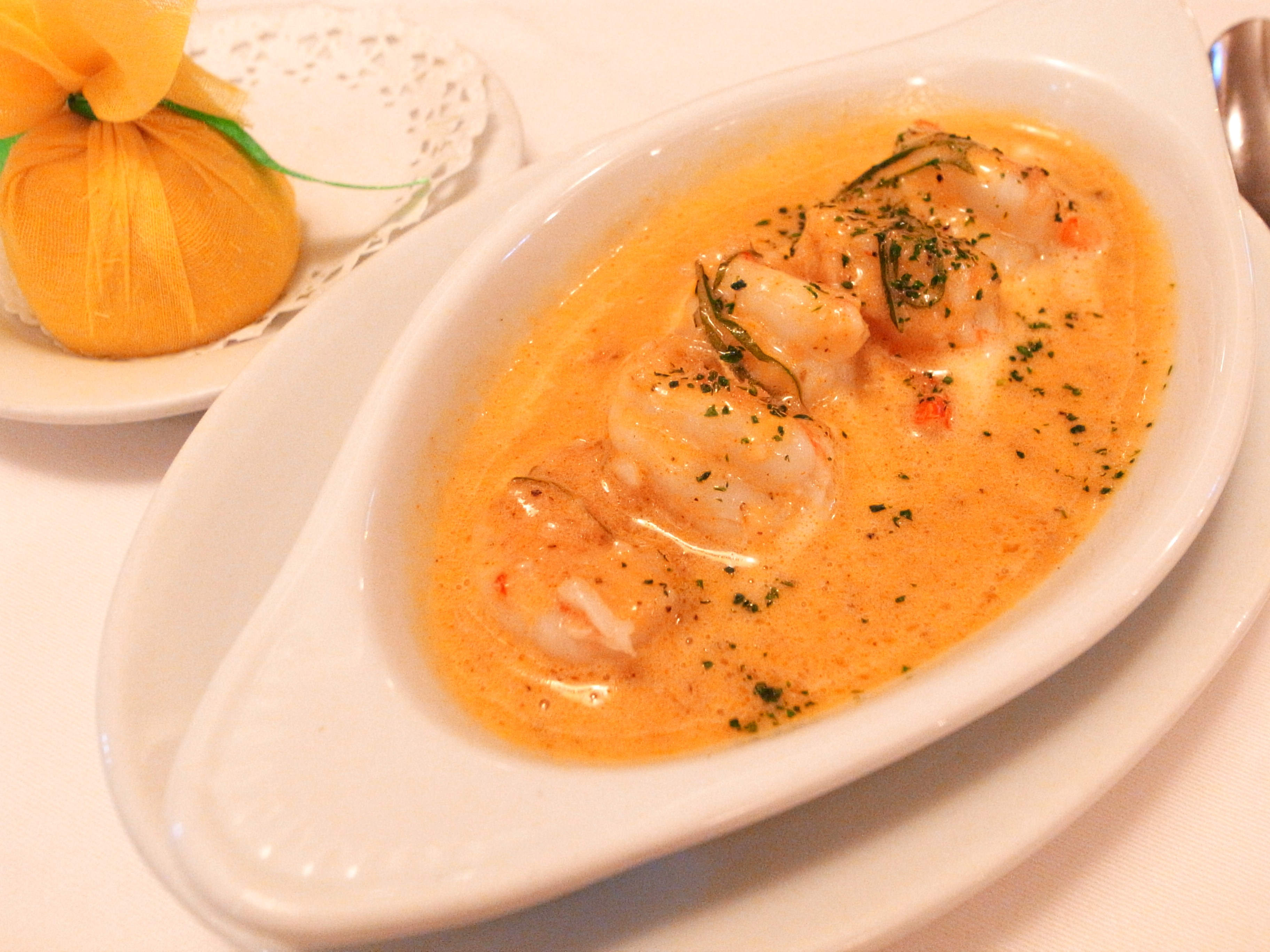 前者醬汁微酸微辣很開胃配上五隻鮮度夠富口感的蝦子是一道很棒的前餐,