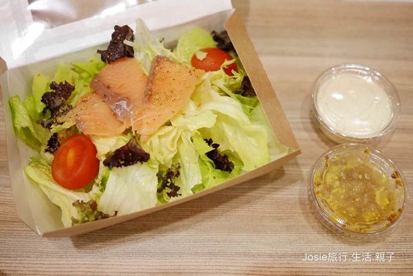 鮮嫩滑順口感的煙燻鮭魚和新鮮的生菜,有濃郁凱薩醬和清爽油醋醬二種可供選擇 (二擇一)