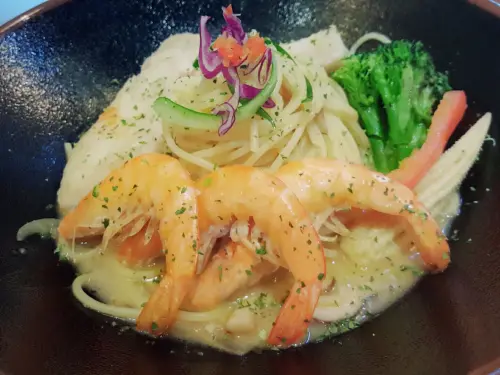 他爆走直接坐在地上踢腳吵著要肉。幸好這盤香蒜奶油義大利麵合