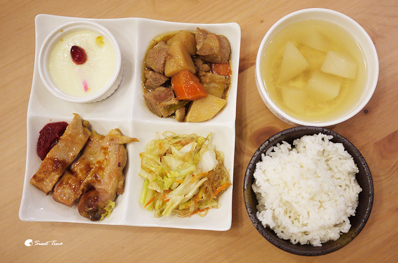 馬鈴薯燉肉佐蒜香去骨雞腿排套餐 - 套餐的內容是二個雙主餐、二樣菜、一碗飯、附湯及蔓越莓鮮果汁,餐點內容非常鄰家,像在吃媽媽的拿手菜似的,不油膩確很美味。