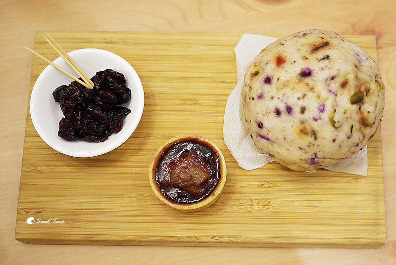 點心類的有三色饅頭、蔓越莓蘋果塔,還有店家讓我們品嚐的蔓越莓果乾。