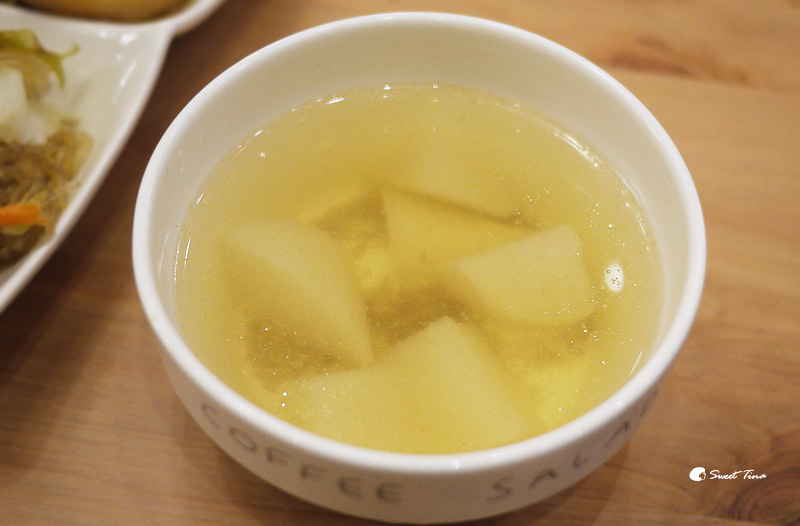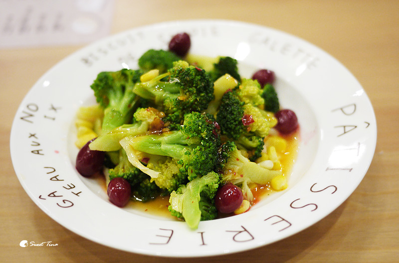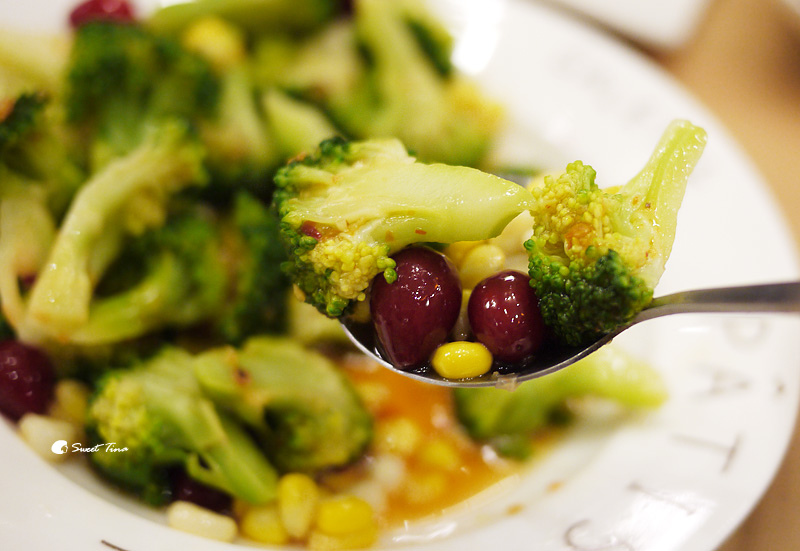 蔓越莓溫沙拉 - 川燙過的花椰菜搭上玉米粒及蔓越莓果粒,醬汁酸酸甜甜的,真的好清爽好美味哦,整個食慾都大開了,最後連湯汁也不想放過拿來淋飯了XD,這道推薦必點~