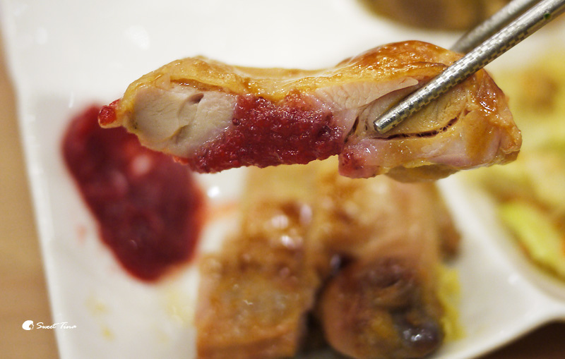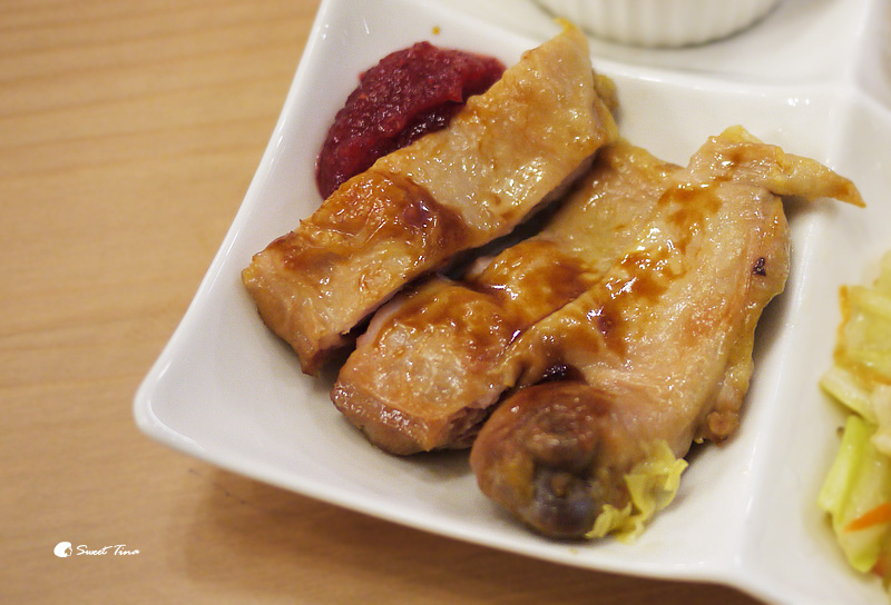 去骨雞腿排經過簡單的調味後,帶點蒜香且多汁油嫰,沾上蔓越莓果粒調製的醬汁後變得清爽可口,沒想到蔓越莓拿來當食物的醬汁這麼的對味呢。