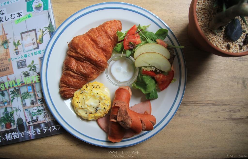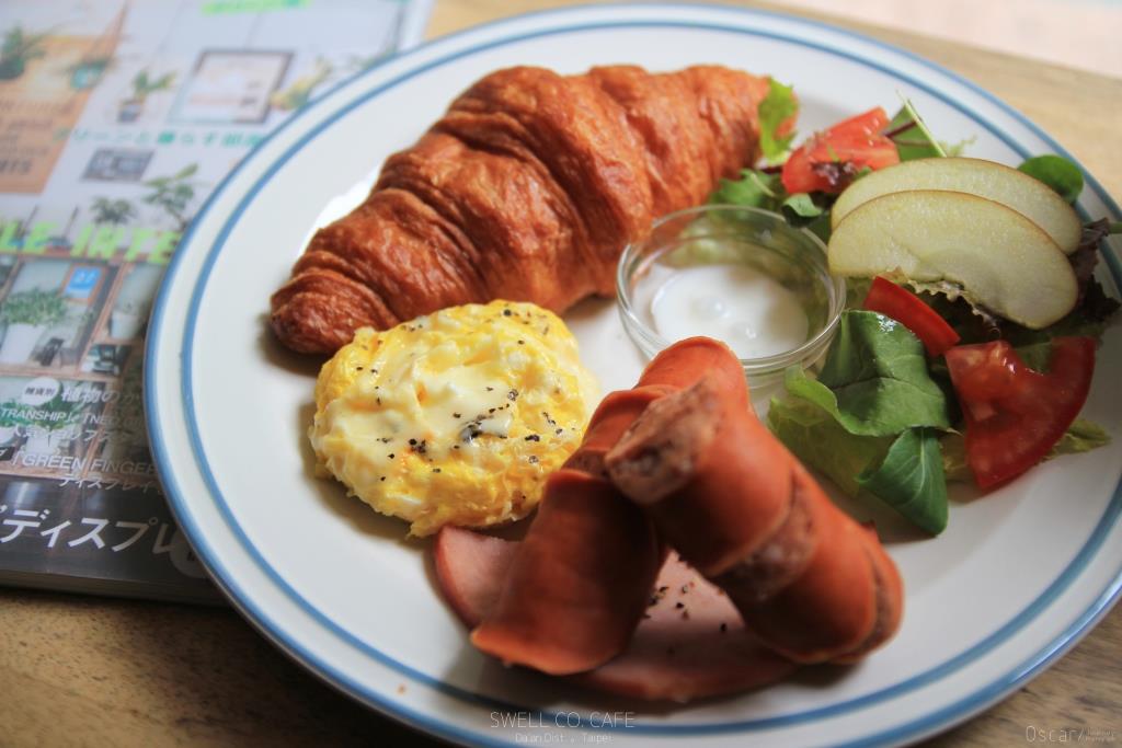 以簡單的沙拉 德式香腸 火腿 水波蛋及可頌所組合而成