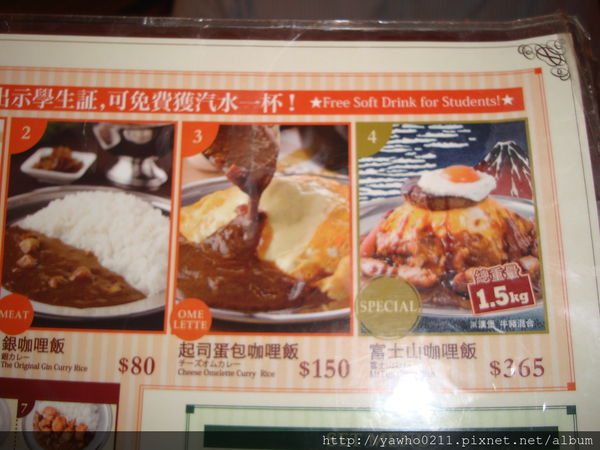 拍點菜單給大家看,這家有名的是富士山咖哩飯,不過份量之大1.5KG不是隨便可以挑戰的,真的下次想來試看看!!