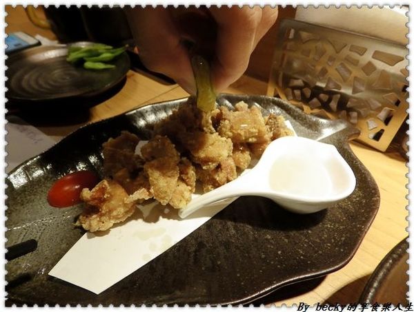 這個炸雞肉質鮮嫰,外皮炸的酥脆,單吃就很美味~淋上了小金桔,微酸感可能提味。