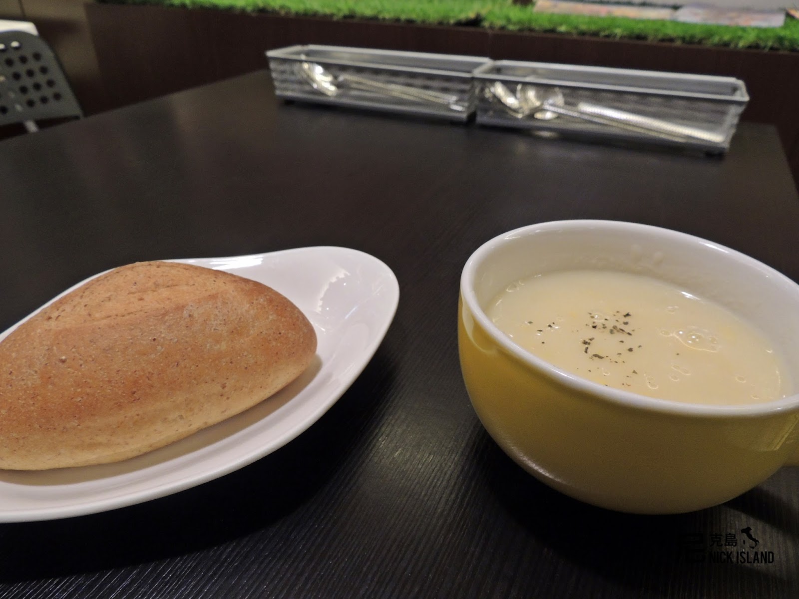 升級套餐附贈的麵包及濃湯,麵包是現烤的法國鬆軟麵包,嚼起來香氣十足,麵包搭配玉米濃湯非常美味。