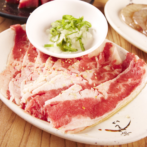 「蔥鹽牛五花」/油花分布均勻,口感不會過分油膩或柴澀,在烤盤上滋滋作響,放入口中咀嚼,烤得恰到好處的肉品,湯汁緩緩流出,佐蔥鹽一起享用,豪邁大啖肉香。