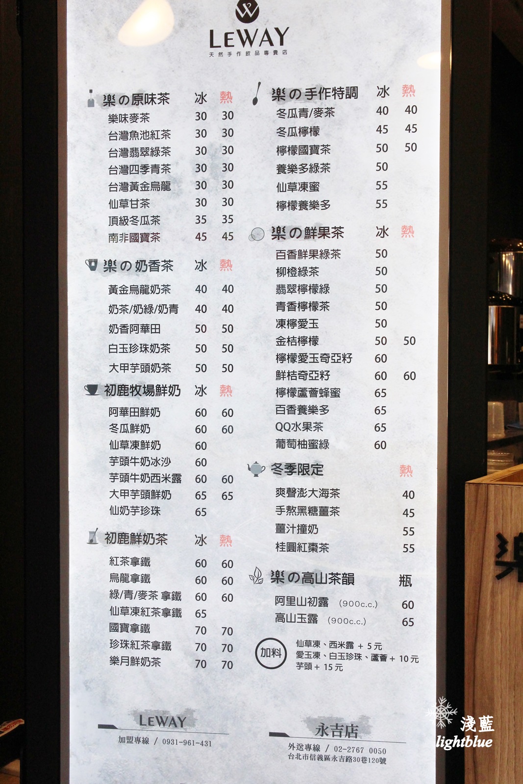 菜單如下,全品項都是使用台灣茶葉、初鹿鮮奶,無防腐劑無色素的天然飲品