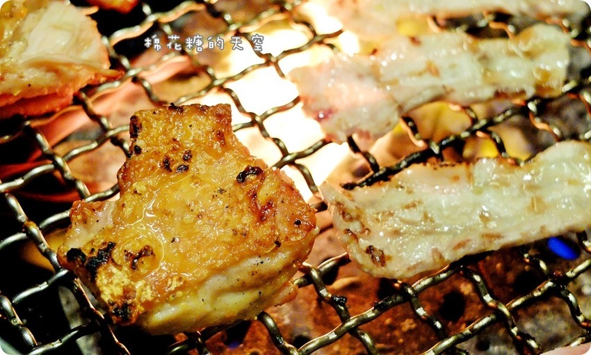 雞腿丁記得先烤皮的這一邊~這樣才能把肉汁鎖在裡面,因為厚度比較厚~所以通常會把他擺在邊邊慢慢烤,這些都是服務人員一邊烤一邊教我們的小撇步喔!看看那金黃的雞皮…太邪惡了…就讓我來把他消滅吧!