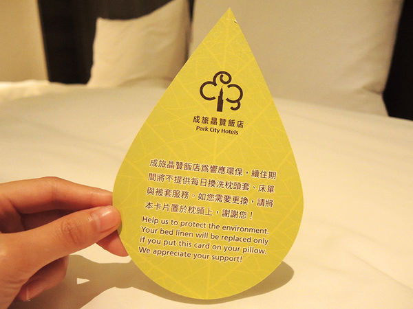 若有需要更換的話,請將床上水滴狀的綠色卡片置於枕頭上提醒服務人員喔!