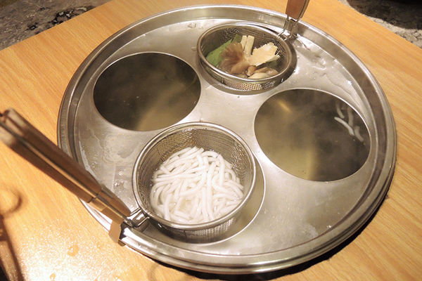 將米苔目與菇類蔬菜分別各放一網,等到浮起來就可以盛裝淋上肉臊汁!