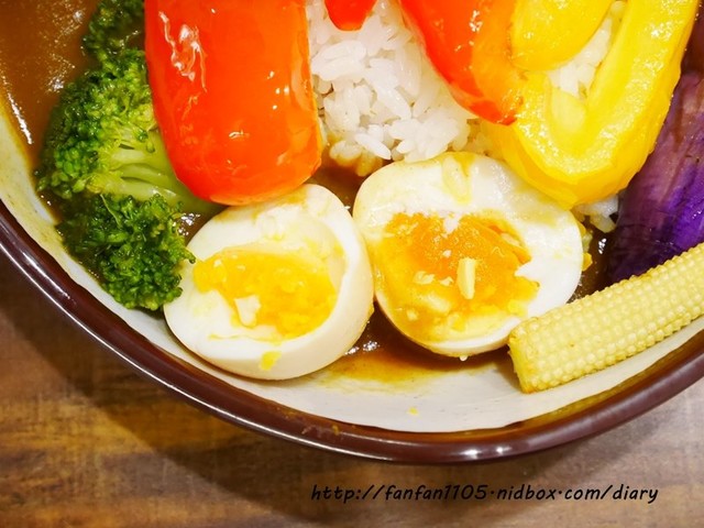 每道餐點的配菜都有花椰菜、一整顆的溏心蛋、咖哩醬