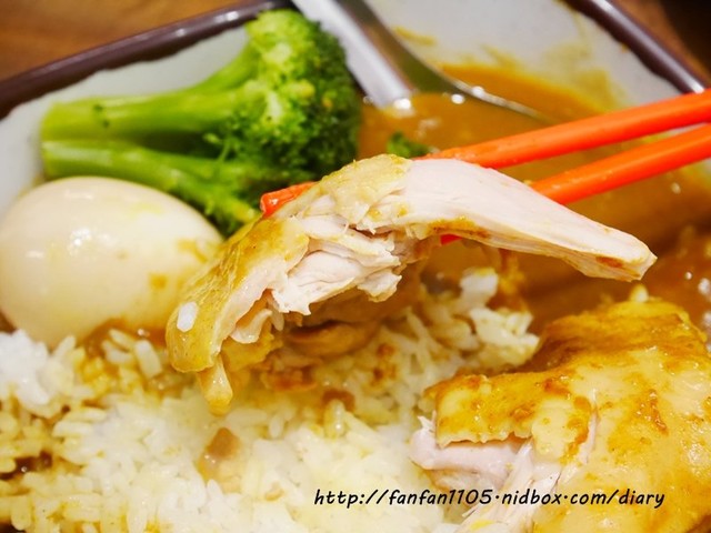 雞腿排是使用咖哩的醬汁去滷製,無骨, 咖哩香氣十足